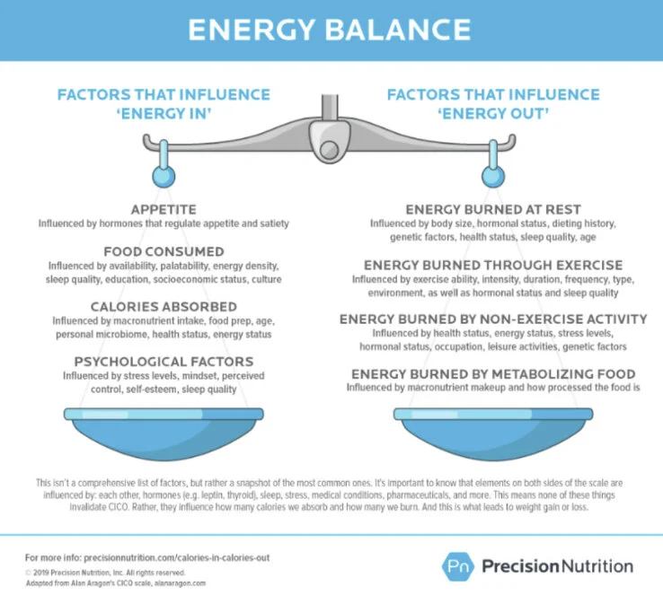 There are a multitude of other factors that will impact your body's ability to use and burn energy (calories). These range from your hormones, to your sleep quality, your mental state and stress levels, or your genetic disposition, just to name a few. Below is a visual to demonstrate all of the different factors that influence your individual "energy in" vs. "energy out." For a GREAT article on this, head here.